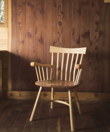 I started off making straight copies of traditional Windsor chairs over 25 years ago. My chairs have evolved somewhat but I still aspire to the old styles and techniques. Power tool use is kept to a minimum and the machinery that I do use is powered by the wind and sun.